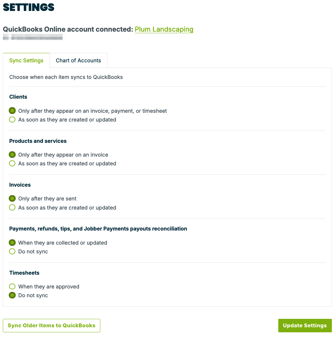 - Chart of accounts (this setting is only available if you are using Jobber Payments)