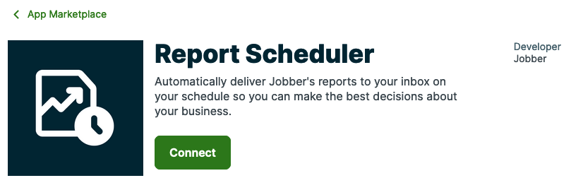 To connect the Report Scheduler app to your Jobber account, click the Gear Icon > App Marketplace. From App Marketplace, locate the Report Scheduler and click on it to open the app details.Â