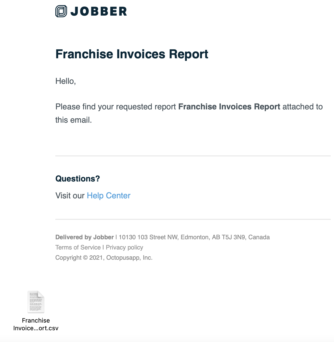 Franchise report emails are sent to the email address of the user who requested the report. These emails contain the word âfranchiseâ to clarify that data shown here is an aggregate of the data from all your accounts. Attached to this email is the .csv file with the report. The furthest left column in the report is for Account Name to make it clear which of your accounts each line of data belongs to.