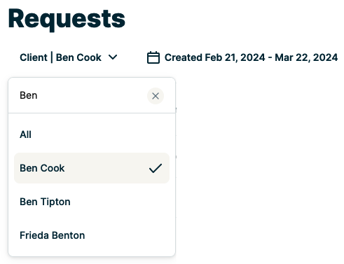 To filter the report by client to show a just a single clientâs requests, click on the Client filter dropdown, search for the clientâs name, and then select the clientâs name.Â