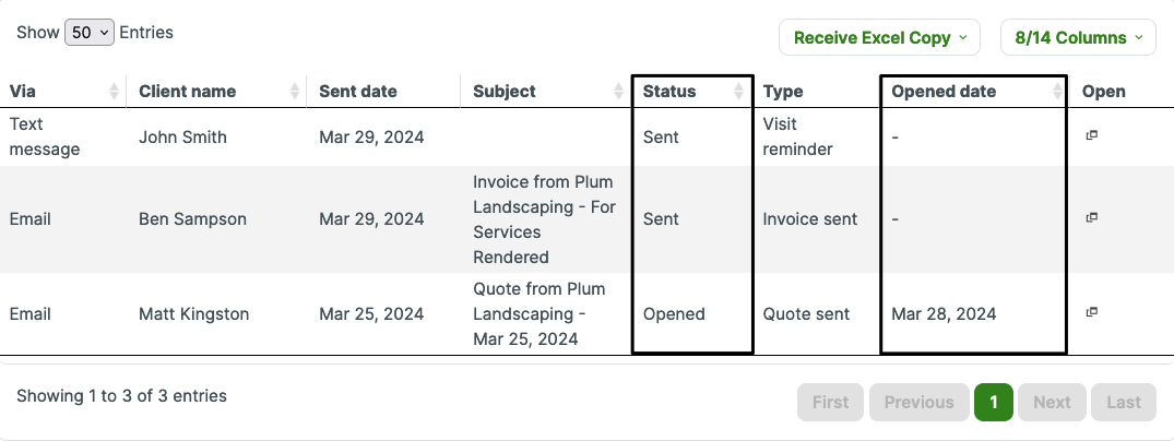 The client communications report shows all email and text messages sent from your Jobber account to your clients. This report is where you can make sure the communication was delivered, preview the message, and view if it was opened.