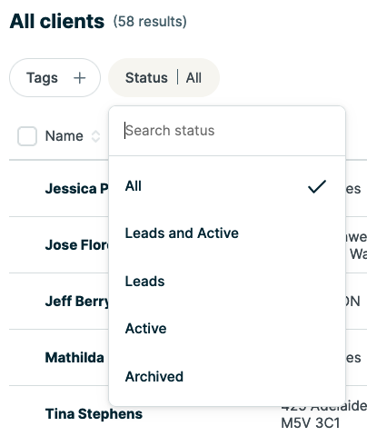 To narrow down your client list, tags and statuses can be used as filters. Click Tags or Status to open a list of all tags and statuses and select one to filter the list. If you are filtering the list with tags, multiple tags can be selected. Learn more about Tags.