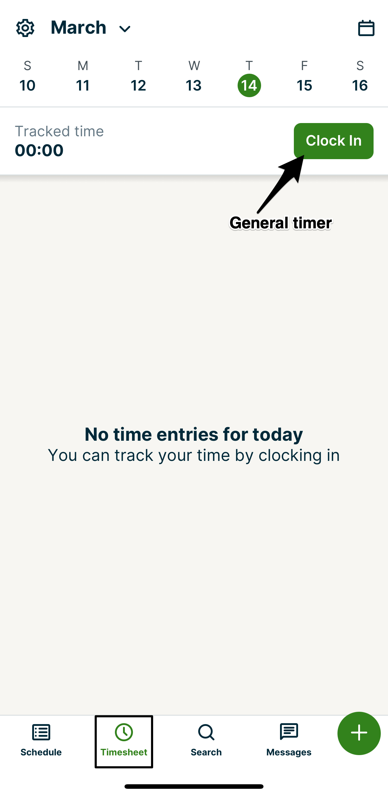 From the Time Sheet tab, tap Clock In to start the general timer. At the end of the day, you will return to this page to Clock Out.Â