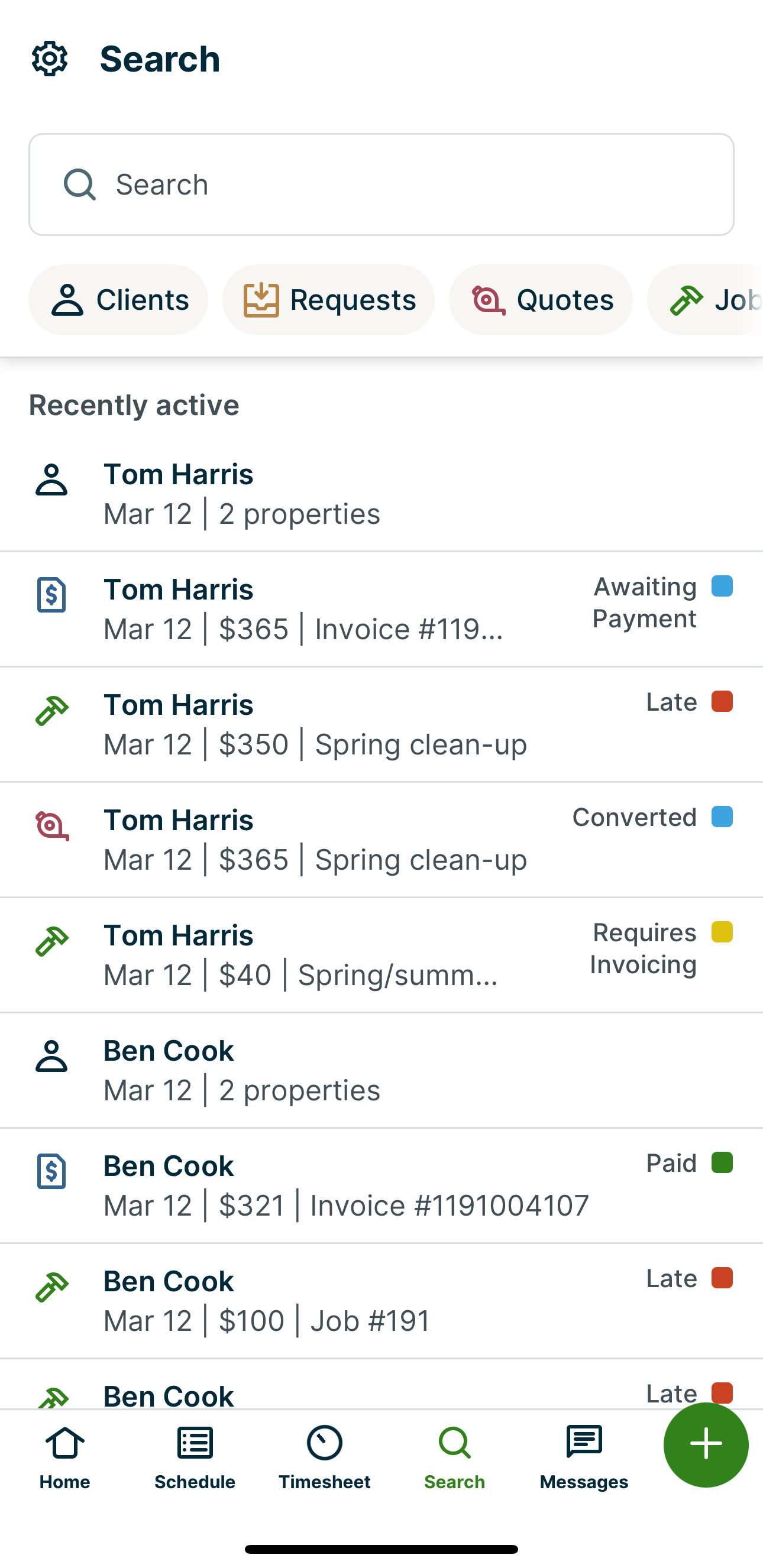 Beyond just clients, you can also view recently updated requests, quotes, jobs, and invoices. This client list shows to users who have the user permissions to view all clients, or the worker default permission (or higher).Â