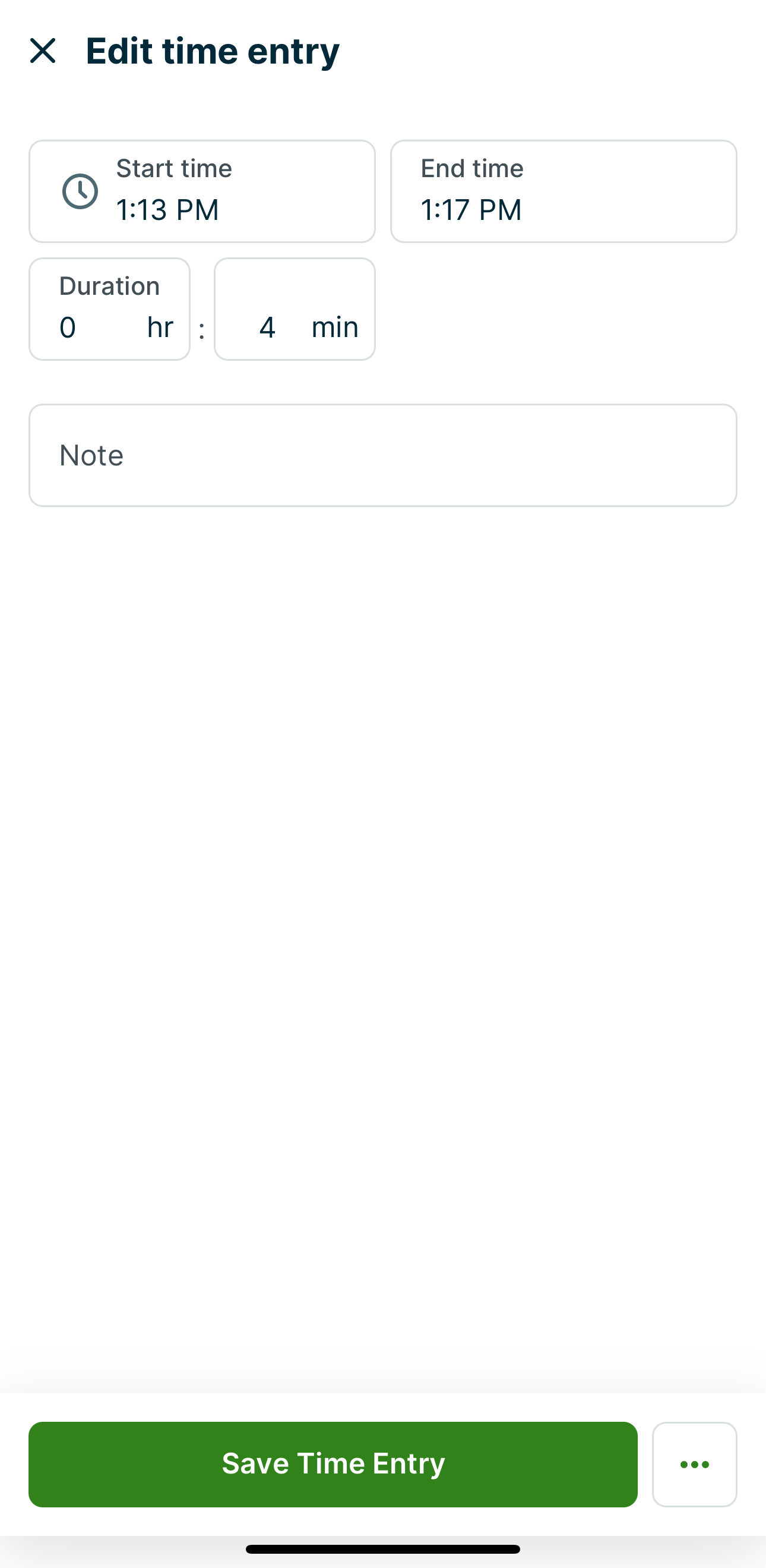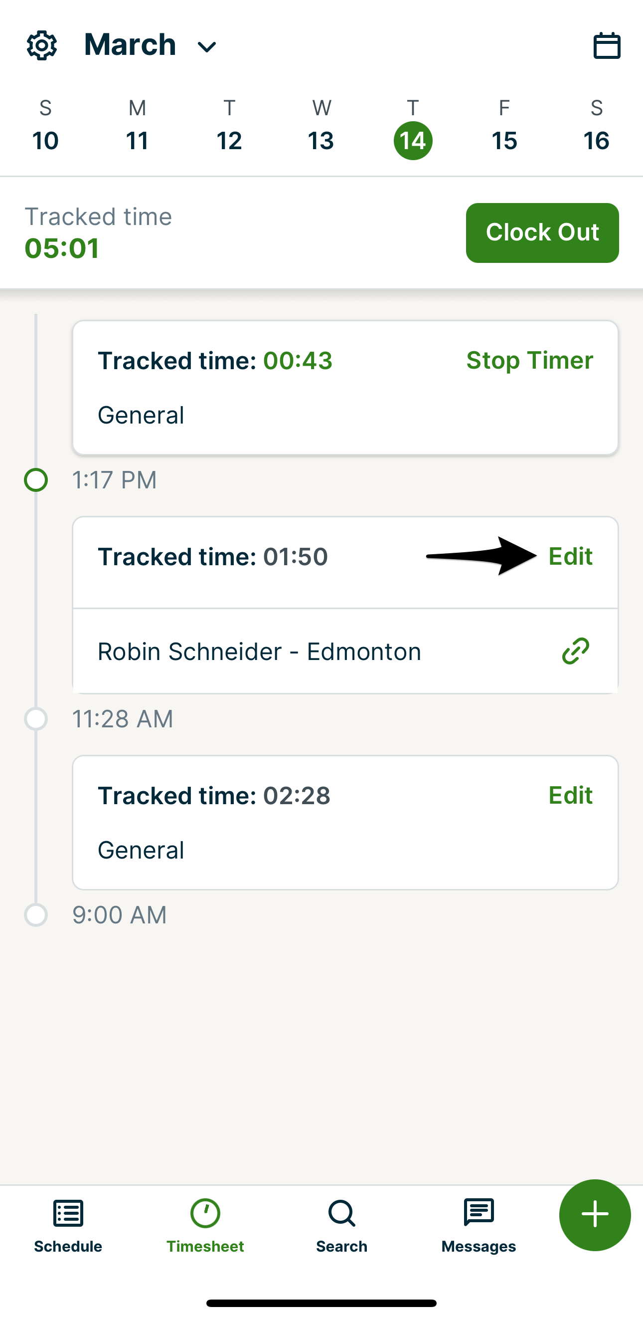 Later in the day, you’ll see your time entries appear on the Time Sheet tab as you start and stop timers throughout the day. If you need to edit any of your time entries including adding a note, tap Edit on the time entry.Â