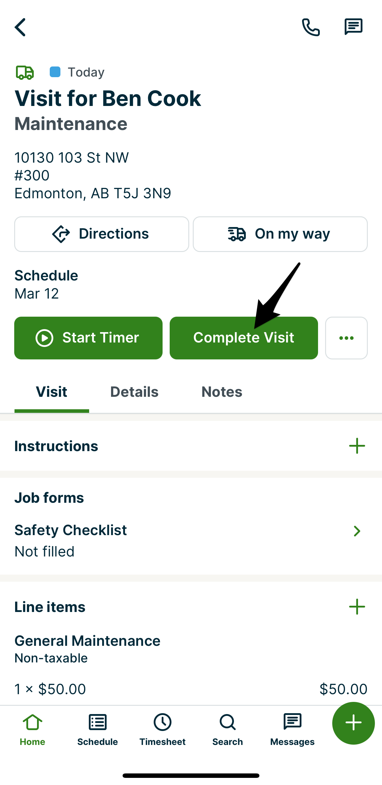 âś… View your schedule in the app and tap on a visit. Familiarize yourself with where to start a job timer, leave a note, as well as where to view and fill out a job form.