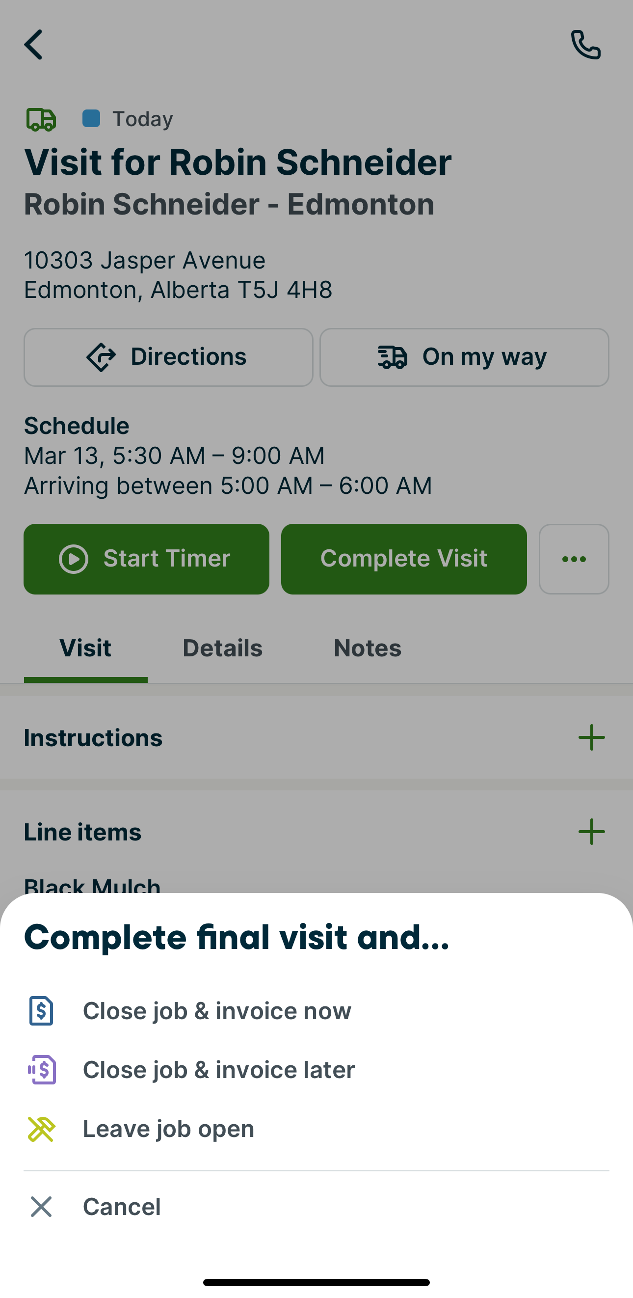 - Leave job open: The job will remain open, but the visit will be completed. This might be the option you’d select if more visits need to be scheduled or if there is still work to be done.Â