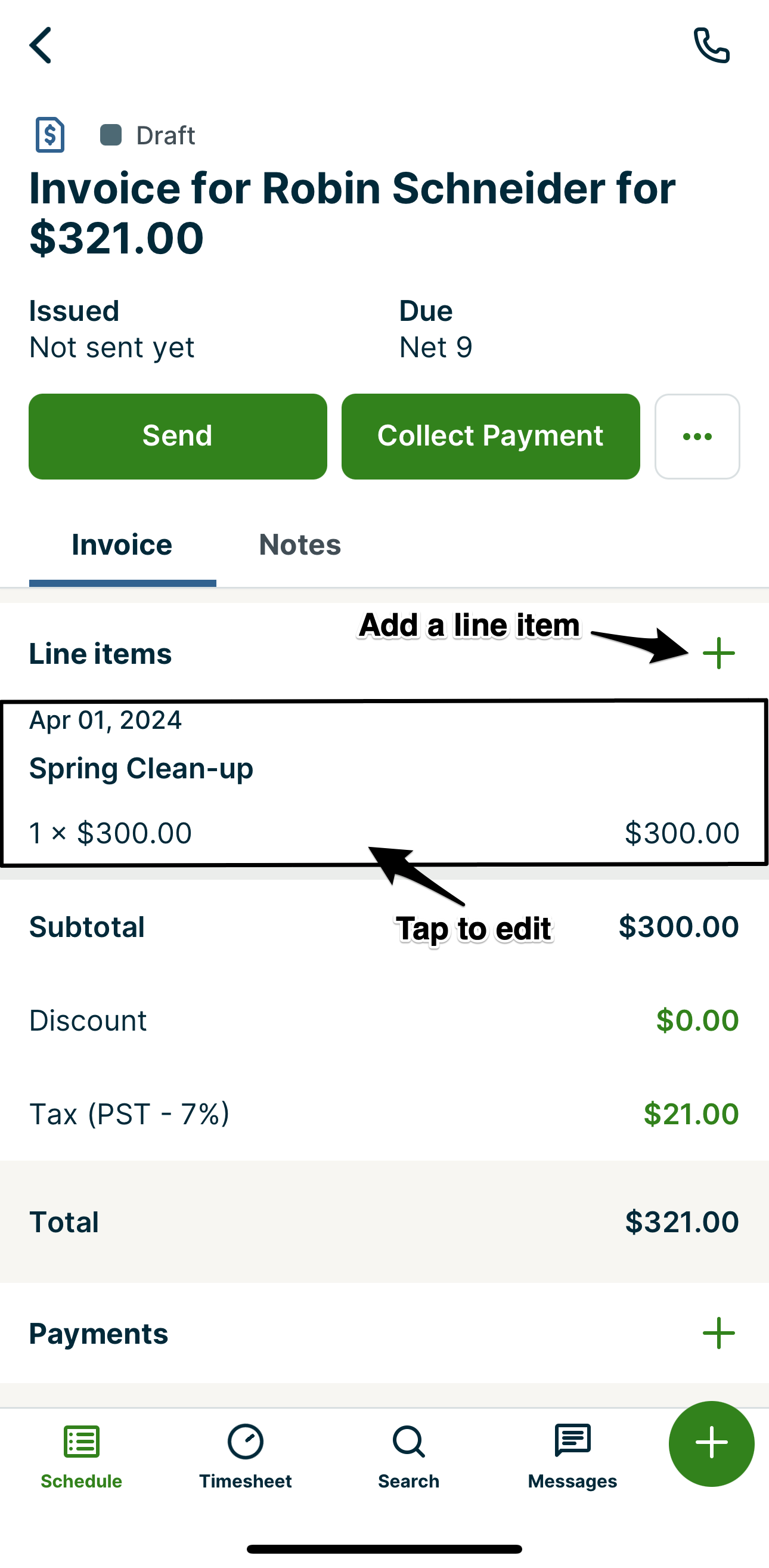 When the invoice is created, it will be in draft status. To send it to the client by text message or email tap Review & Send.