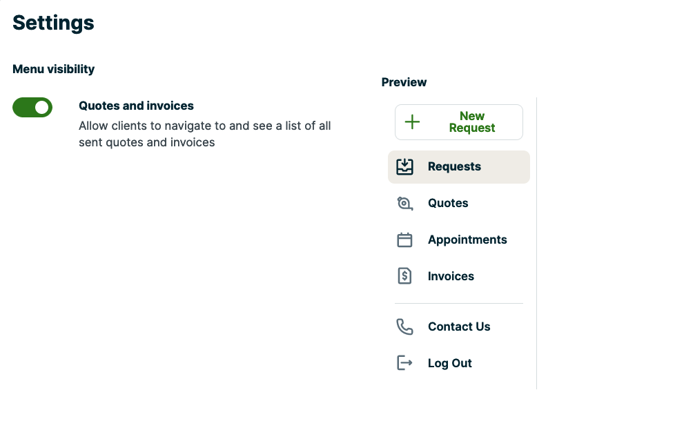 Toggle on Quotes and Invoices so that when logged in, clients can see all of the quotes and invoices youâve sent. If turned off, your client can only access an invoice or quote directly from the email or text message you have sent them with that quote or invoice. When toggled off, they wonât see quotes and invoices as an option from the side navigation bar.Â