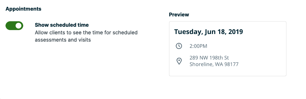 Toggle on Show scheduled time to display the scheduled time of the appointment in client hub. Both job visits and work request assessments will appear under the appointments heading. When this is toggled off, clients will still see details like the date and location of the appointment, however, the time will be hidden.