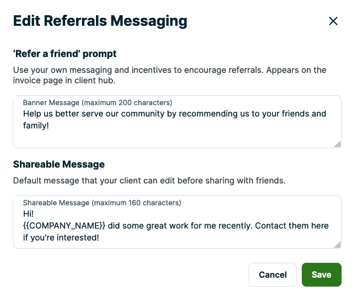 To customize the banner message, from your Referrals Settings click Edit. This pop-up is where you can customize both the banner message as well as the message the default message that your clients can send to their friends along with your request form link.Â
