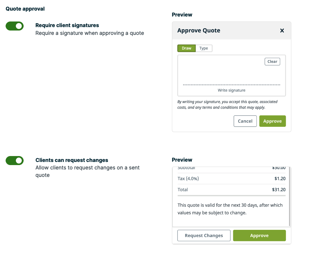 Toggle on Require client signatures to require clients to sign when approving a quote. Signatures collected will be added as an internal note on the quote.Â