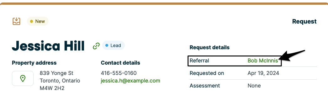 When a new request comes in from a client who was referred by a friend, you’ll see a Referral field on the request that links to the client who referred them. If you want to thank or reward your clients who refer new business to you, this field is a good way to track which clients are making referrals.