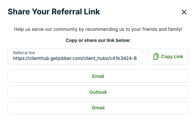Client hub is your customer’s online portal where they can request work, approve quotes, review scheduled jobs, make payments, and refer their friends. Asking your clients to refer a friend to your business is an easy way to make sure you’re never missing a referral opportunity since clients will be prompted automatically in client hub when paying an invoice.