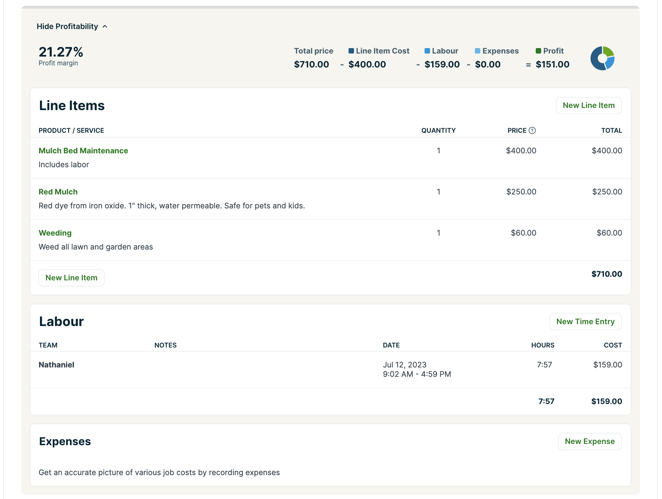 **The profit bar appears on one-off jobs on select plans as part of Jobberâs job costing feature. To minimize the profit bar, select Hide Profitability. - Line items