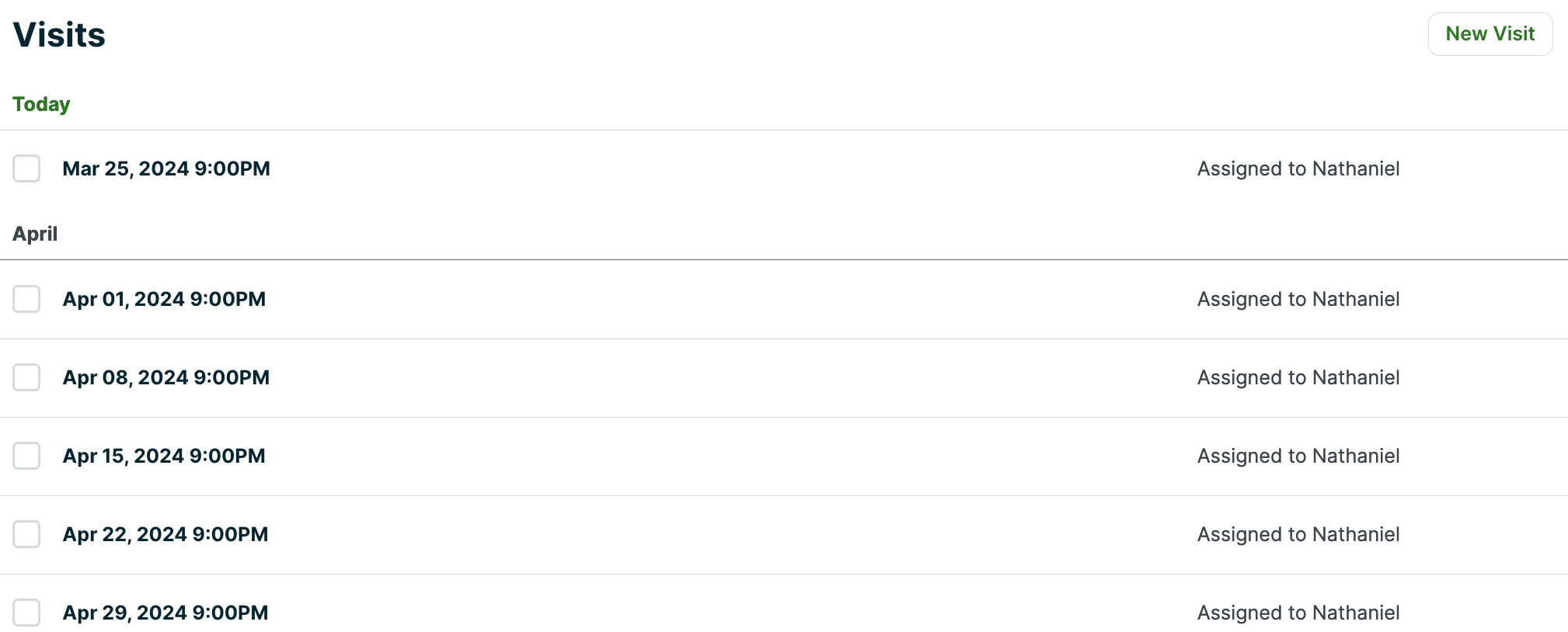 Visits are created when the job is created based on the schedule. You can also add another visit to the job manually. From the visits section of the job, select the New Visit button.