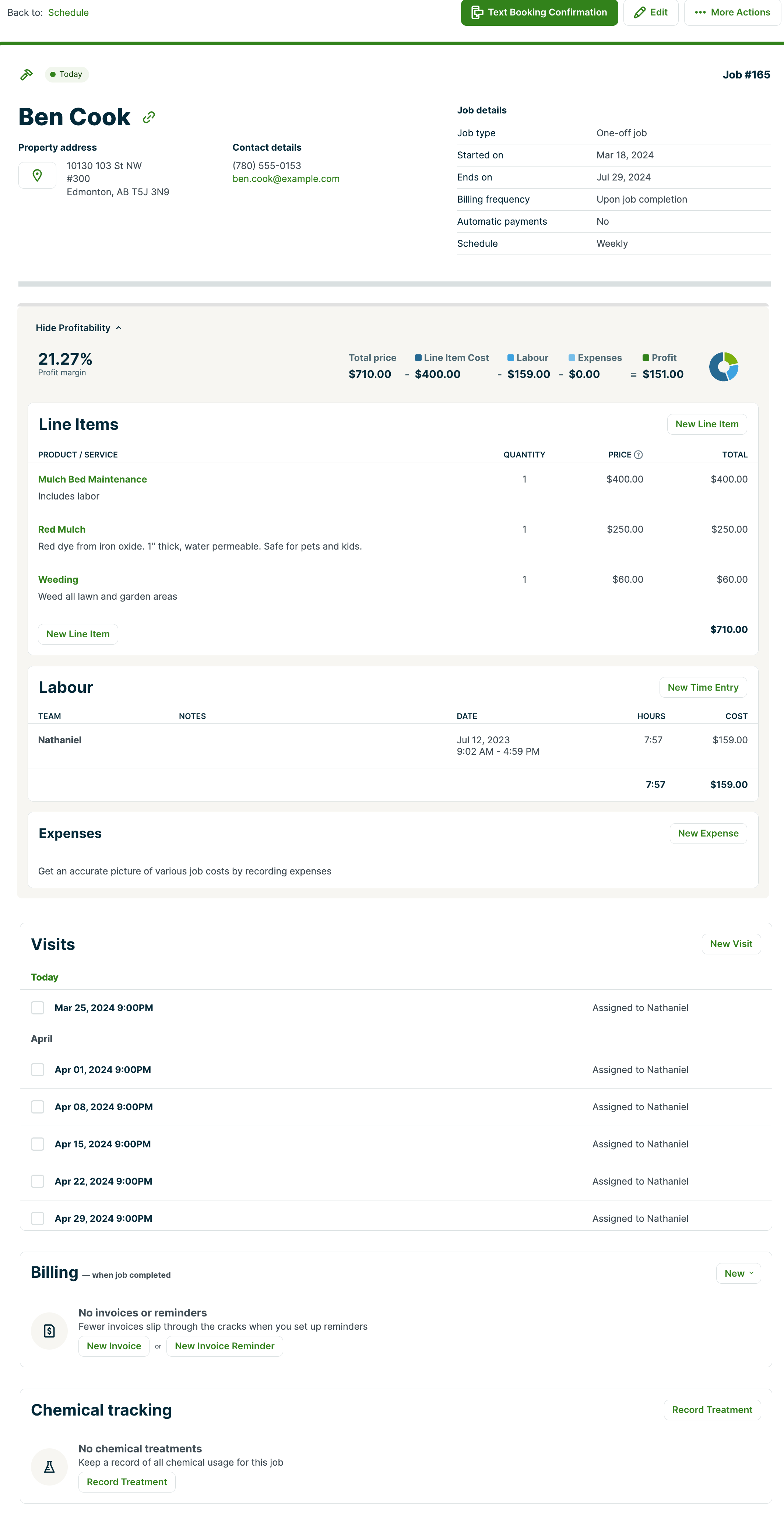 Below is an example of what a job will look like once created and an overview of what is in each section. The job shown below is an example of what a job might look like on the Grow Plan, including job costing, time tracking, expense tracking, and chemical tracking.Â