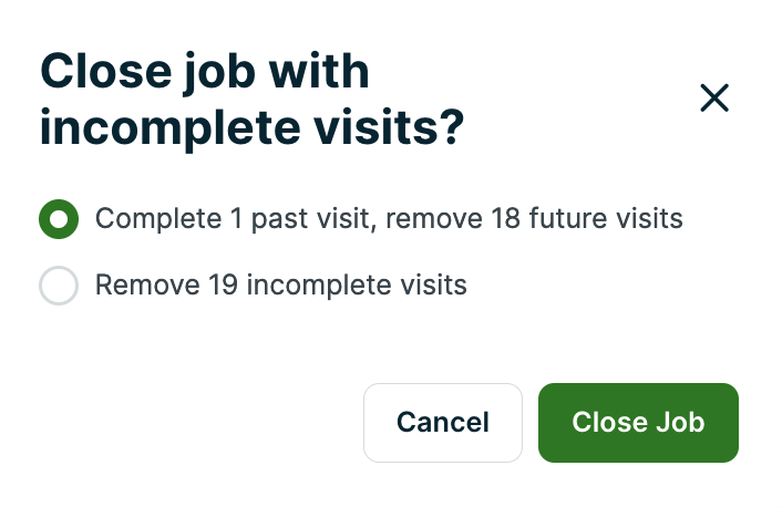 Close job: To close (or cancel) a job, click More Actions > Close Job. If the job needs to be invoiced, then it will go to the Requires Invoicing status, once it has been invoiced it will then show as Archived. If the job does not need to be invoiced then it will go to Archived status right after being closed. If the job has incomplete visits in the past or scheduled today (including later today) Jobber will prompt you to complete them in case these visits were done but not marked complete. If there are incomplete visits in the future (beyond today), Jobber wonât prompt you to complete these visits and instead ask if youâd like to remove them.Â
