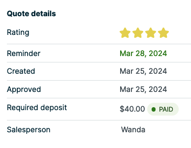 Once the full amount of the required deposit has been recorded, the required deposit on the quote will say PAID beside it.