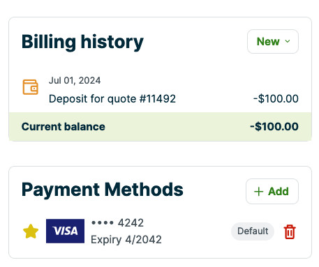 If you view the client’s profile in Jobber.com you will see this deposit recorded in their billing history box. If the client allowed the card to be securely saved for future use you will also see that information below the billing history box.