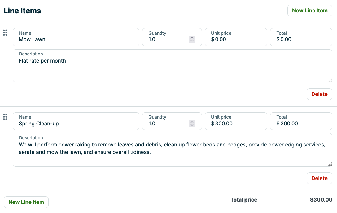 If you have any products or services that you will definitely be offering and charging for, chose the + Add Line Item button. These line items will be reflected in the subtotal for the quote. Quotes must have at least one regular line item.