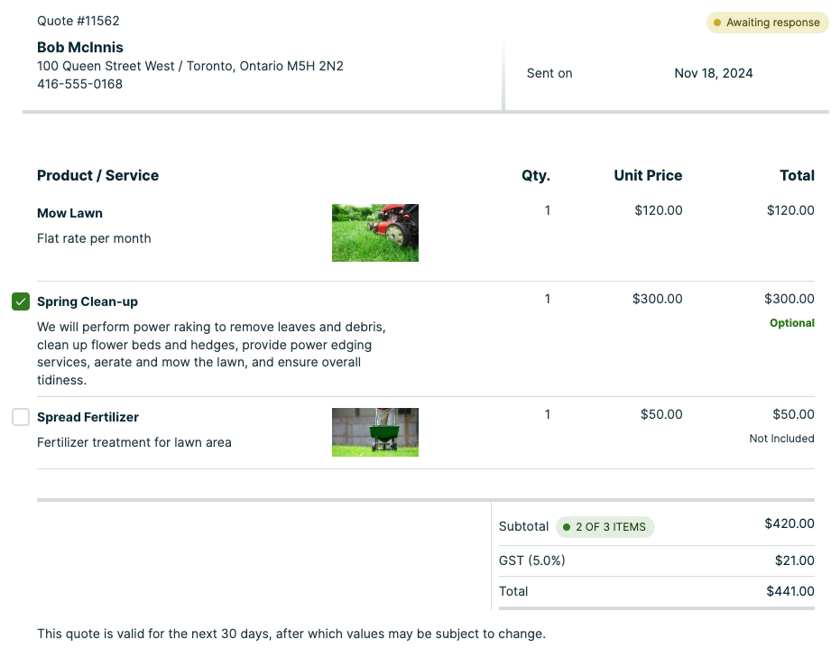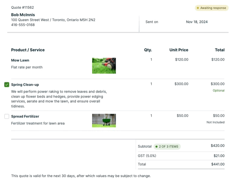 Optional line items on quotes give your clients the ability to add on items to their quotes.