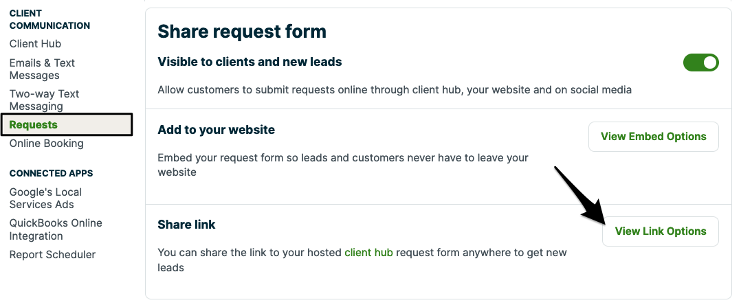 Jobber request forms have an embed code that can be copied from within your Jobber account via Gear Icon > Settings > Requests. From the requests page, click Share request form > View link options.
