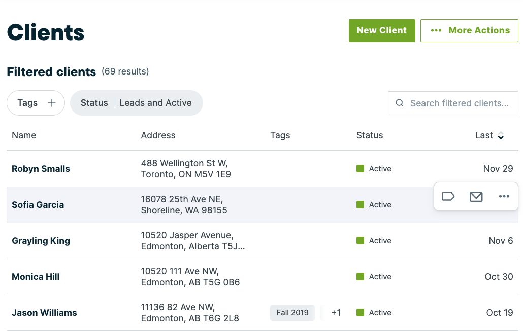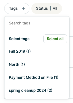 To narrow down your client list, tags and statuses can be used as filters. Click Tags or Status to open a list of all tags and statuses and select one to filter the list. If you are filtering the list with tags, multiple tags can be selected. Learn more about Tags.