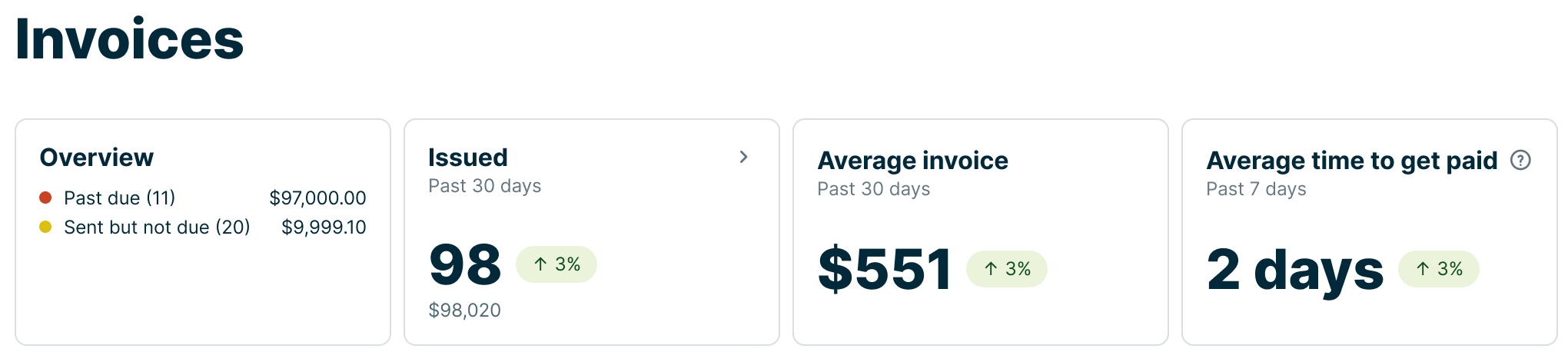 - Average invoice price: This is the average dollar value of all invoices issued over the past 30 days (not including today). Hover over the trend indicator to view how this compares to the previous 30 day period. Select this insight to view the invoices report. The invoices report has a column for “days to paid” that shows the number of days from when the invoice was issued until the status on the invoice switched to “paid”.