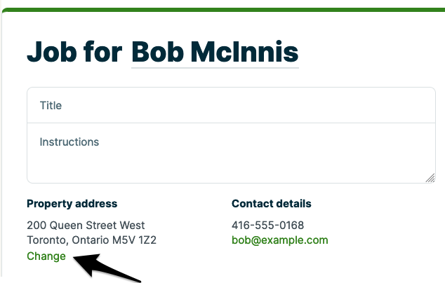 If you selected an existing client, you’ll be taken to start creating a new item for them. From the property details section of that page, click Change.Â