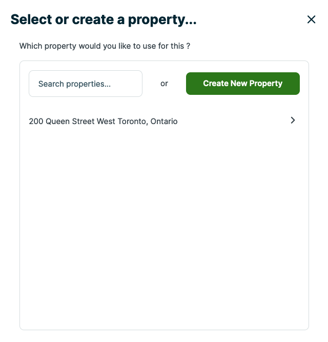 You will then be prompted to select from the client’s existing properties or create a new one. To add a new property for this client, click Create New Property.Â