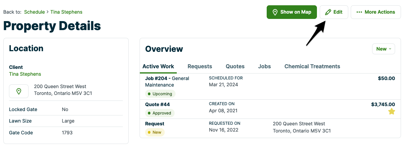 To delete a property, navigate to the property page. You can get here by clicking on the property address from the client page in Jobber, or by using the global search.